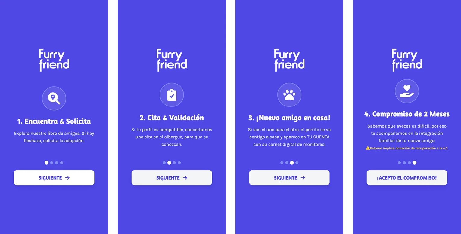 Diseñé una experiencia centrada en transparencia antes que conversión: el onboarding no persuade, orienta, mostrando el proceso completo de adopción y cada fase con claridad.