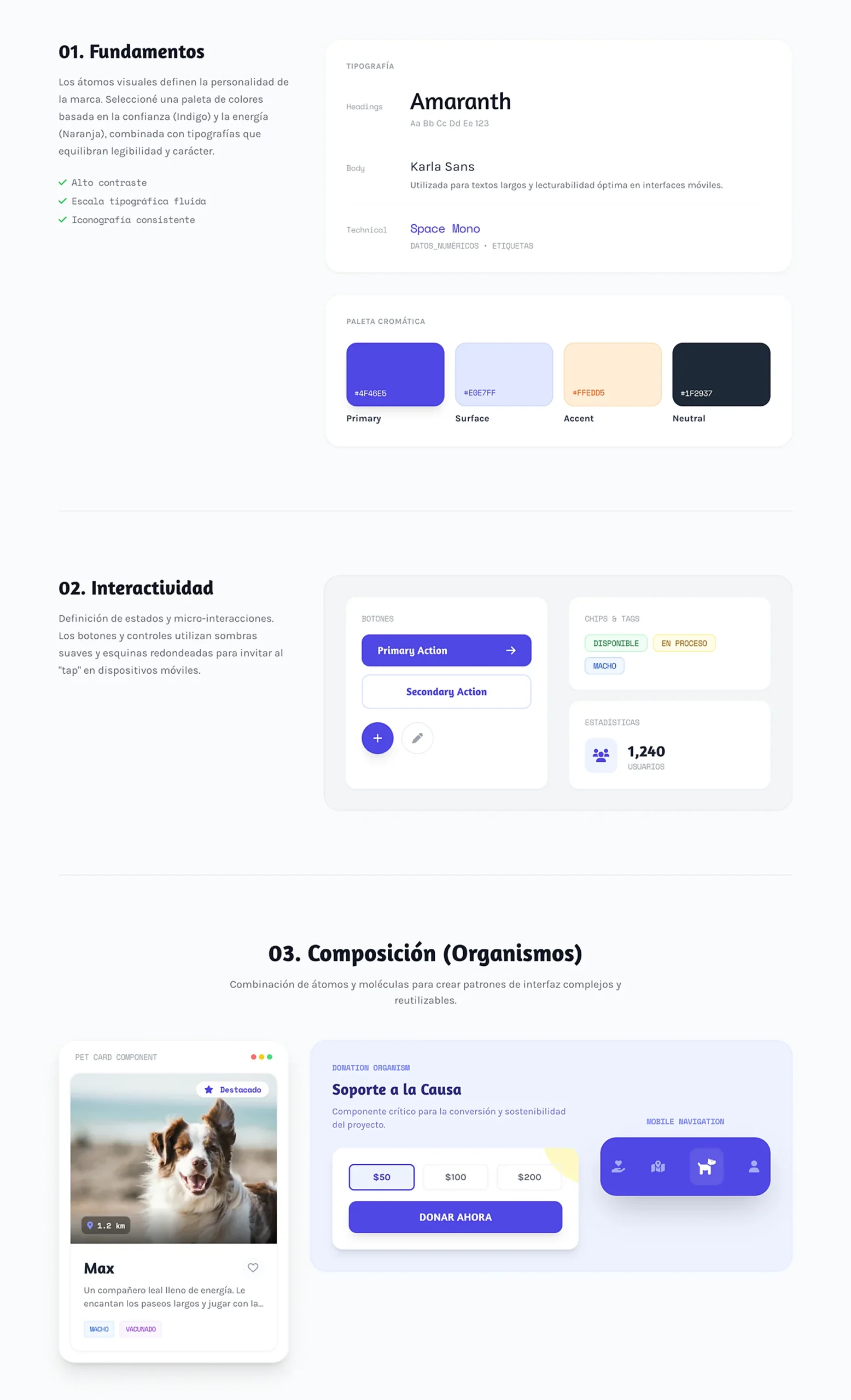 Construí un sistema de diseño escalable basado en Atomic Design para unificar la experiencia entre adoptantes y refugios, priorizando accesibilidad y consistencia.